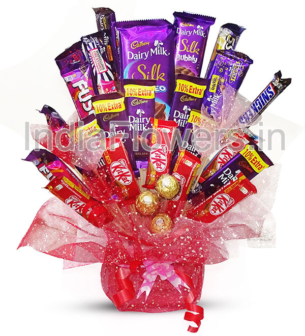 Bouquet of Mixed Chocolates, this chocolate gift contains 3pc Ferrero Rocher, 6pc Kitkats 18g., 6pc Dairy Milk 25g., 2pc Fuse 50g., 2pc Snickers 28g., 4pc Dairymilk Flavoured 36g., 1pc 5star 43g., 1pc Silk Bubbly 50g., 1pc Big Silk Chocolate Bar 137g. arranged beautifully with beautiful packing and ribbons. Please note we may substitute chocolate / flavours in case of unavailability.