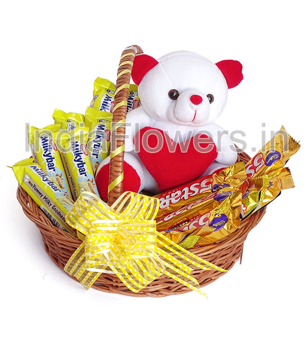Soft Toy, Basket of Milky Bar and 5star Chocolates, contains 7pc Milky bar 40g. and 5pc 5Star chocolates 43g. each with 6 Inch Teddy.