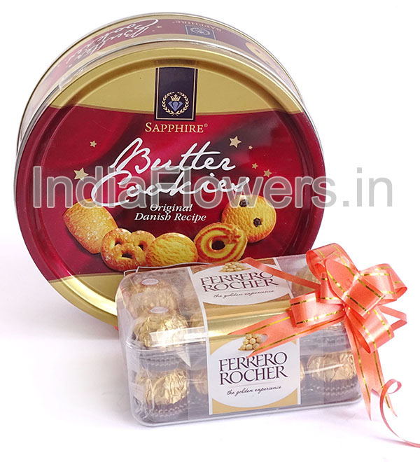 Cookies Chocolates Combo of 1pc Danish Cookes 400g. and 16pc Ferrero Rocher Chocolates.