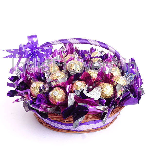 Basket of 16pc Premium Ferrero Rocher Chocolates nicely decorated with Purple metallic cellophone and ribbons